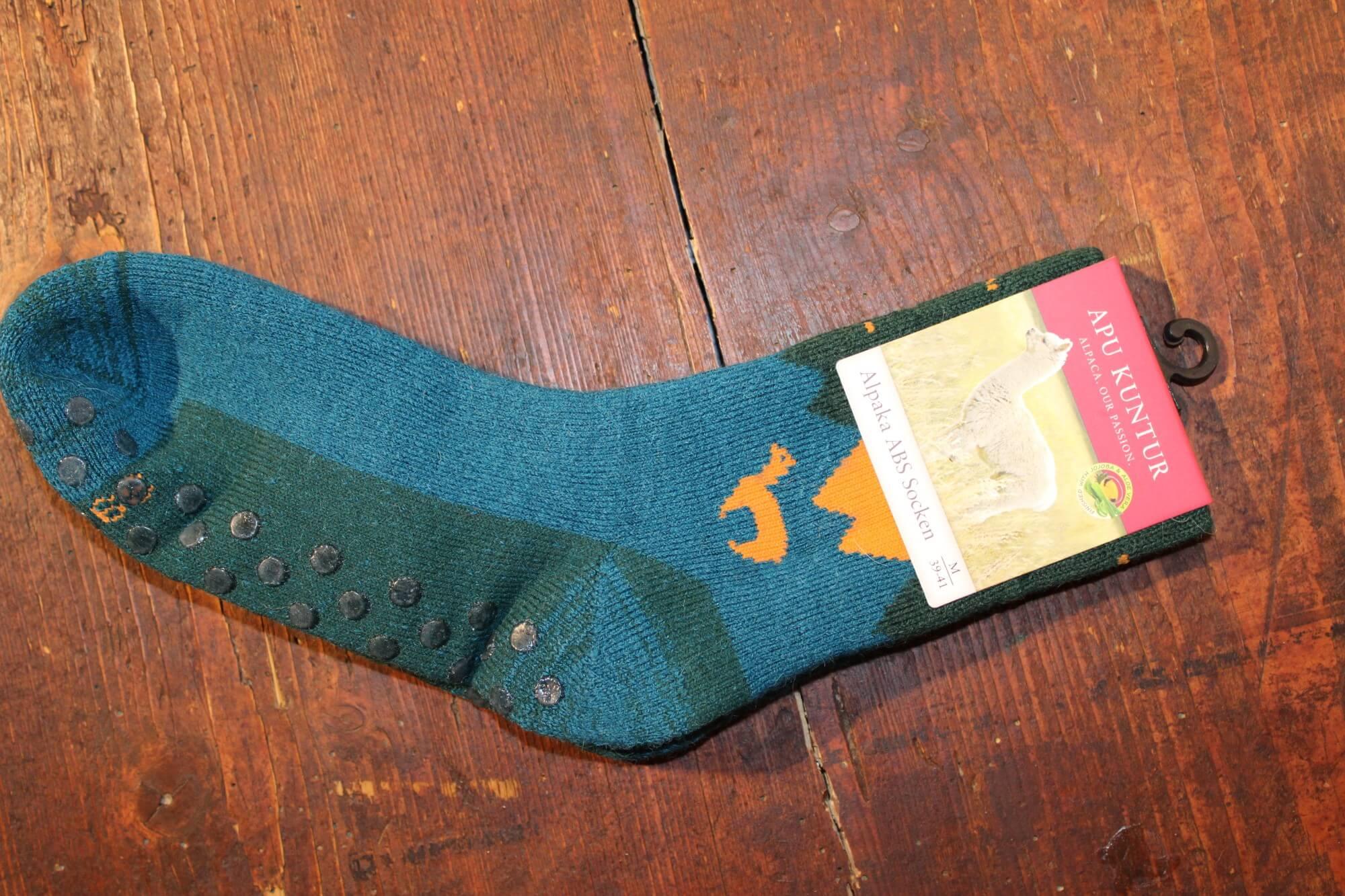 Alpaka-Socken rutschfest beschichtet, feines Bündchen, atmunghsaktiv mit Alkapa Logo eingestrickt.